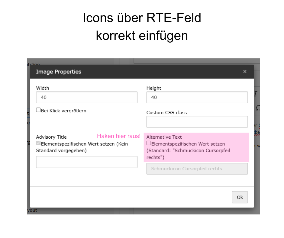 Achtung: werden Icons direkt im RTE-Feld (Text-Feld) eingebunden, bitte den Haken bei “Alternative Text” entfernen