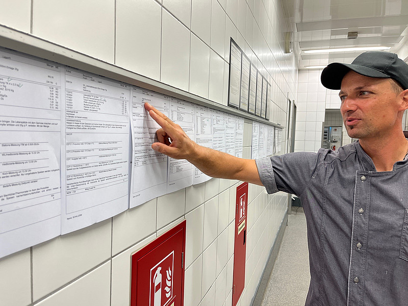 14:00 Uhr. Sebastian Schellerer holt mich aus der Spülküche. Die Köche und die Diätassistentin treffen sich im Sozialraum, um die heute verwendeten Rezepturen zu besprechen. Köchin Martina Römer hat die Rezepturblätter eingesammelt. Das Team geht jetzt Stück für Stück durch. Ist genügend Salz im Rezept vermerkt? Welche Stärke wurde zum Andicken verwendet? Wurden Dinge im Arbeitsprozess spontan angepasst und wenn ja, haben sie sich bewährt und sollten in die Rezeptur übernommen werden? Wie hat sich dieses oder jenes Lebensmittel verarbeiten lassen? Die Küche übernimmt diese Änderungen am nächsten Tag in die Datenbank.