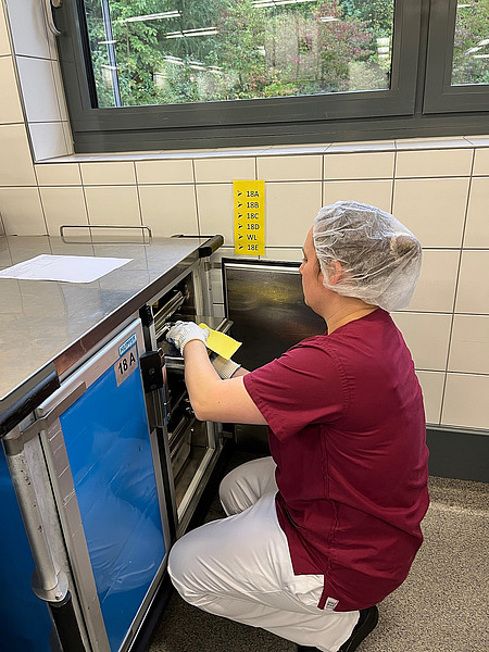 Zweiter Bereich sind die hygienischen Kontrollen vor Ort in allen Küchenbereichen während der Produktion. Dazu gehört das regelmäßige Temperatur Messen (75 Grad Celsius müssen im Kern jeder Warmspeise erreicht werden) und die Entnahme von Proben von allen Gerichten. Diese werden 14 Tage aufgehoben. Dafür gibt es – na klar! – einen eigenen Kühlbereich. „Falls es auf einer Station zu einem Infektionsgeschehen kommt, werden gleich alle infrage kommenden Proben lebensmitteltechnisch untersucht“, sagt Monika Schiller. Sie prüft später auch jeden einzelnen Warmhaltewagen, ob da ja das Richtige und Bestellte für jede Station drin ist.