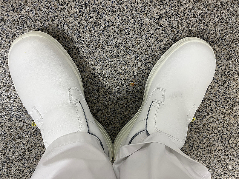 06:00 Uhr. Seit einigen Jahren ist Sebastian Schellerer Küchenleiter. Jung, sportlich, energisch erlebe ich ihn bei der Begrüßung. Ohne Kochmütze, dafür mit schwarzem Käppi. Er hat meinen heutigen Tagesplan im Kopf: „Zuerst bekommen Sie Schuhe und Arbeitskleidung“. In der Wäscheausgabe erhalte ich einen Kasack und Arbeitshosen, Schellerer hat Arbeitsschuhe und – aha! – eine schwarze Schirmmütze für mich.