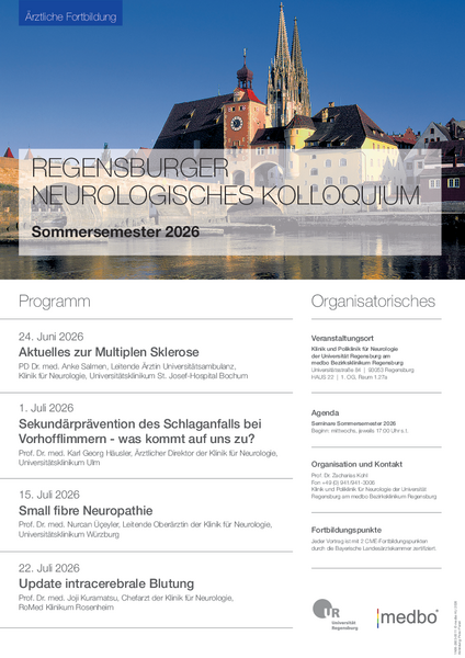 Das Neurologische Kolloquium ist eine Veranstaltungsreihe der Klinik für Neurologie der Universität Regensburg am medbo Bezirksklinikum Regensburg. Es wendet sich an Haus- und Fachärzt:innen sowie an Vertreter:innen aus Forschung & Lehre.